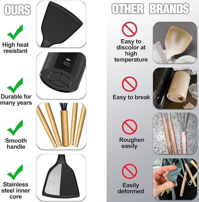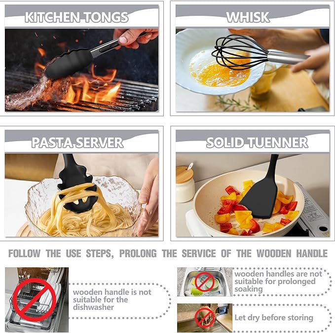 34PCS KITCHEN UTENSILS SET WITH HOLDER From the everyday kitchen spoons to the garlic crusher, This 34PCS kitchen utensils tools set included all the kitchen stuff you could possibly need to bring out your inner chef. This means you don’t have to spend extra money on repetitive utensil tools. This cooking utensils set includes a Slotted Spatula, Slotted Spoon, Turner, Pasta Server, Kitchen Tongs, Grater, Scissors, and so on. It is a great starter pack for a first apartment HEAT-RESISTANT, NON-MELTING-SOFT SILICONE One of the best things about Umite Chef silicone cooking utensils is their ability to withstand heat safely, each kitchen gadgetsl is heat-resistant up to a whopping 446°F and won’t melt (even leave it in the pot for a while) and our utensils head won't even become knicked or warped even at those extreme temperatures. The soft silicone won’t scratch non-stick cookware or your expensive pans VINTAGE WOODEN HANDLE -EASY TO CLEAN Each wooden handle is made of solid wood which is anti scalding. Smooth and comfortable to the touch, it completely prevents the heat transfer during the cooking process. Please note that each wooden handle has a slightly different color and texture. The one-piece design eliminates any gaps where food can get trapped, making cleaning a breeze. PLEASE NOTE that due to the wooden handle, We don't recommend soaking in water for a long time or dishwasher cleaning ODORLESS BPA-FREE, FOOD-GRADE SILICONE Each utensil is made of food-grade silicone, BPA-free, can use in any type of food. Stainless steel is wrapped inside to maintain its shape and flexibility, ensuring no warping. And it will not retain odors or colors like plastic kitchen utensils. ATTENTION Before the first use, the original smell will disappear after the silicone soaking in water and exposed it to the air for about 3 hours GREAT GIFT SET This kitchen utensil set comes with everything you need to get started cooking. A utensils holder can help you organized your kitchen tools well. If you moving or just need a new set of cooking utensils highly recommended. Perfect for house warming gifts, wedding gifts, mother's day gifts, holiday gifts and anyone else on your gift list