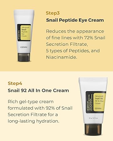 COSRX's Most Loved 4-step Advanced Snail Trial Kit: Skincare essentials formulated with snail mucin for repairing, moisturizing, and soothing skin. Advanced Snail Mucin Gel Cleanser (0.67 fl. oz) - With 10,000ppm snail secretion filtrate, it protects the skin barrier and does not strip the skin. Advanced Snail 96 Mucin Power Essence (1.01 fl. oz) - Lightweight yet intense moisturizing essence absorbs very fast into the skin and maximizes skin elasticity. Advanced Snail Peptide Eye Cream (0.16 fl. oz) - Contains 72% of snail secretion filtrate and peptides to reduce dark circles, fine lines and wrinkles. Advanced Snail 92 All In One Cream (0.70 oz) - With 92% of snail secretion filtrate helps repair and soothe sensitized skin after breakouts by replenishing moisture