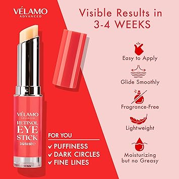 The Retinol Eye Cream for Dark Circles and Puffiness - VELAMO ADVANCED retinol eye stick is s a complete multi-treatment balm for younger-looking, brighter, and well-rested eyes. Our eye brightener stick works like a charm as under eye cream anti aging solution. This power-packed and do-it-all balm visibly boosts bounce and moisture levels. Most importantly, it is safe for sensitive skin. ????Clinically Proven Visible Results in ????-???? ???????????????????? - Our brightening eye balm reduces fine lines and dark circles. It hydrates, firms, and brightens. It locks in moisture, improves firmness and tone, and softens wrinkles and crow’s feet. Puffiness, dark circles & wrinkles - these 3 major eye concerns will be taken care perfectly. Most of our customers experienced visible results after 3-4 weeks. ✔️Easy to Use - After your nightly cleanses, glide the retinol eye stick around your entire eye area in small, circular motions. Be careful - not to tug on the skin. We recommend you try once per 2-3 days to allow your skin to adjust to the retinol in the beginning, after 2-4 weeks you may apply once daily at night. ????Clean, Vegan, and Effective Ingredients - Encapsulated retinol, power peptide complex, vegan squalane, and astaxanthin target signs of aging for a more youthful appearance. VELAMO ADVANCED under eye cream stick would gain peace for your eyes and confidence for you through beauty! Satisfaction Customer Service - We care about our customers and stand for every sold stick! We're always here for you. Do not hesitate to contact us if you need any help with our product. Our professional customer service team is dedicated to fixing any kind of issue you might meet.