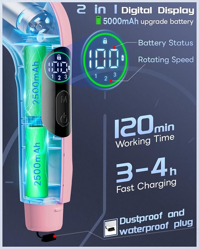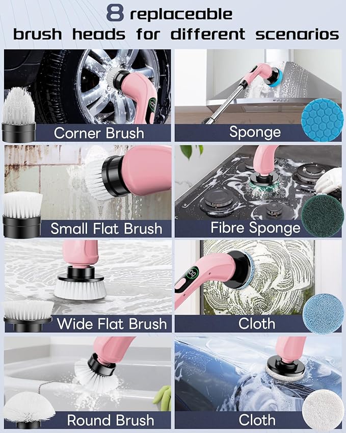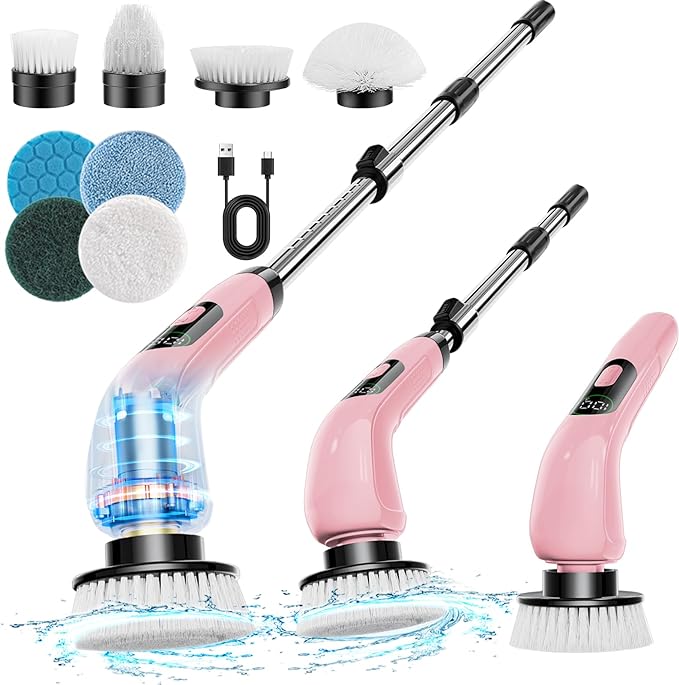 【Powerful & Efficiency】The maximum speed of the Upgrade Electric Spin Scrubber is 500r/Min, can easily remove stubborn stains, 25% more powerful than other products. Perfect for cleaning shower bathrooms, toilets, bathtubs, stone tile floors, grooves, and even hard-to-reach places. Make your home look new! 【Adjustable Length & All-round Cleaning 】The power shower spin scrubber comes with an extension stainless-steel handle, Length can be adjusted from 36.2 inches to 43.3 inches. Free your knees and lower back from tub to ceiling. 【8 Multi-Purpose Brush Heads】Includes 8 replaceable cleaning brushes for various scenarios. Flat brush for surfaces like tile floor, wall, and pool; corner brush is excellent for cleaning grout, faucets, and edges; cloth brush for wooden floor and furniture cleaning; the sponge is for the window. This brush also be used for car washing, too. 【Fast Charging & Cordless & Durable】Fast charge technology and battery level display function. The motorized cordless scrubber is powered by a built-in rechargeable 5000mAh lithium battery that can provide 120 minutes of long-term work after only 3-4 hours of fast charging. 【Waterproof & Saft Cleaning】:Waterproof rating of IPX7 and high-sealing design can be washed directly under the faucet. Don't submerge the electric shower scrubber in water, please remove the brush head and separately wash. With its lightweight and portable design, the cordless power scrubber comes with a hook for easy storage, reeing up your time and energy. 【Great Gift Idea & Warranty】Take care of your family and let them less tired from cleaning. If you have any requests or issues, we promise to solve them within 24 hours. Notice: Please fully charge before the first use after receiving the bathroom scrubber electric.