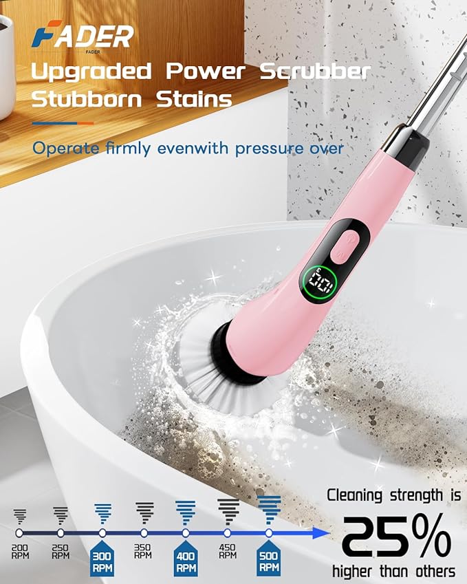 Fader Electric Spin Scrubber, New Cordless Shower Scrubber with 8 Replaceable Brush Heads and Adjustable Extension Handle, Power Cleaning Brush for Bathroom, Kitchen, Car, Tile, Wall, Floor-Pink
