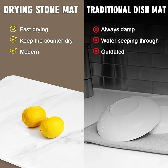 FOOD GRADE MATERIAL: The kitchen counter mat is eco-friendly, made of High-quality & Non-Toxic diatomaceous earth that is perfect for your home and kitchen SUPER ABSORBENT & QUICK DRY: Diatomaceous earth can hold exceptional absorbency and moisture-wicking properties that quickly evaporate water from the surface in minutes NON-SLIP & HEAT RESISTANCE: It comes with 4 Clear Self Adhesive Pads to achieve a double anti-slip effect; Also, it’s an perfect heat-resistant mat up to 450°F/230°C, it can be used together with the baking tray, which has the cooling effect MINIMALIST DESIGNS: The simple and elegant design of the stone dish mat makes it a perfect addition for your kitchen WIDE USED: The stone dish drainer mats can be used on kitchen counter to place washed dishes, cups, milk bottle, knife, fork, spoon and other tableware; It can also be used as heat proof mat, bath mat, pet feeding mat, an ideal gift for mother, wife, aunt, girlfried SIZE: The size is 15.8''x11.8'', suitable for most kitchen ware and tableware WARRANTY: We provide 365 days no worry warranty, if you have any problem with the stone bath mat, please feel free to contact us to get help (return/refund in 12 months)