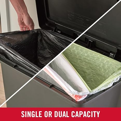 HOLDS 50% MORE TRASH: 19 gallon capacity is greater than traditional 13 gallon, meaning less trips taking out trash. SINGLE OR DUAL CAPACITY: Can use one 30G or larger liner bag for trash or two 13G or 20G liner bags for separating trash and recycling. RECYCLING SOLUTION: The option to use dual compartments makes sorting between trash and recyclables even easier. HIDES LINER BAGS: Integrated LinerLock technology hides liner bags from view to maintain a sleek look and secures the bag to the container to prevent slipping. SLOW CLOSE LID: Quiet, controlled lid closure is designed to reduce unwanted noise and ease down gently. HANDS-FREE USE: The foot pedal removes the need to touch the lid during waste disposal to keep hands clean. STAINLESS STEEL PEDAL: The charcoal stainless-steel foot pedal stands up to daily use. MADE IN THE USA: Manufactured in Winchester, VA.
