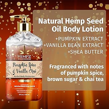 Celebrate fall with Hempz’ limited edition pumpkin spice & vanilla moisturizer (17 oz) – this daily moisturizer uses 100% hemp seed oil, is rich in omega fatty acids & is perfect for women & men with dry or sensitive skin who love the cozy scent of fall Radiate with our fall scented moisturizing formula – sensitive skin finds balance with our light-weight hydrating moisturizer made with sunflower seed oil & shea butter, ensuring a healthy glow & moisture barrier with the fragrance of apple pumpkin spice & vanilla Deep nourishment – conquer dryness & calm your skin with slow aging antioxidants like vitamins A, C, E, & ginger root extract which help to protect against natural & environmentally triggered oxidants Nourishment from nature – harness sustainable & renewable hydration – hemp seed is an eco-friendly source abundant in vital fatty acids like omega 6 & 3. These nutrients help to balance oil, soften skin & hair, & reduce signs of aging Cruelty & allergen free – Hempz products are vegan, gluten free, paraben free, cruelty, free & made in the USA