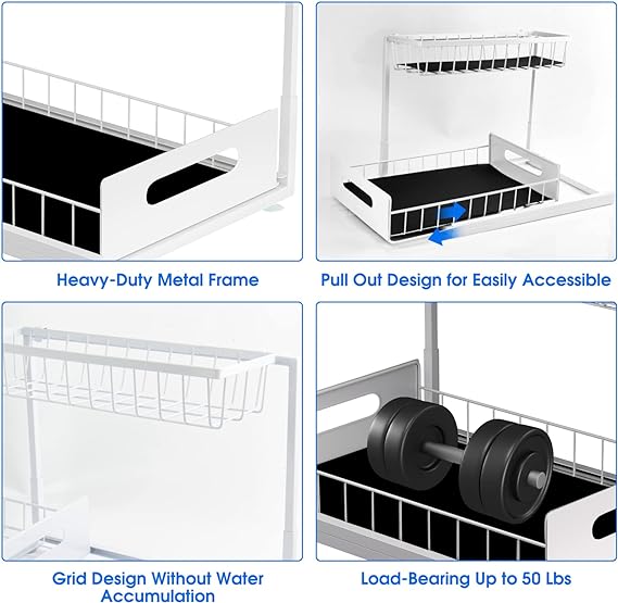 Unique Design: The adjustable under sink organizer can be installed left and right. The L-shaped design, narrow at the top and broad at the bottom, effectively avoids the pipe and fully uses the space for storage. The pull-out design makes it easy and quick to pick up and place items, without worrying about the cabinet being too deep and inconvenient to use. The organizer has a hollow design for ventilation and dryness. Our storage racks solve your storage worries and keep things organized. High-Quality: Our under sink organizer is made of carbon steel, which is durable and resistant. The baking paint process makes the surface more smooth with good anti-rust and can keep the metallic luster even in the wet bathroom or greasy kitchen, the bottom has 4 rubber feet to protect the surface from scratches. The sink rack has a carrying capacity of up to 55lbs and can hold heavier items. It will not deform even if it placing heavy objects for a long time, Pulling is also very smooth. Multifunctional Storage: The shelf organizer is suitable for bathrooms, kitchens, living rooms, closets, garages, laundry rooms, offices, and so on. It can be used to organize kitchen items, spices, cleaning supplies and bathroom toiletries, food, towel, vegetable and fruit, beverage and snack, an office file, book, cosmetics, etc. Easy to Assemble: You can quickly install success without tools. Its simple design and easy installation instruction save your time and reduce your trouble. Assembly Size: Upper layer -L12.95''*W4.72''*H2.35'', Lower layer - L14.17''*W10.6'', Overall height: 11.22''. Quality Assurance: We always focus on product quality and service. If you have any problems after receiving the product, such as not being able to assemble or missing accessories, please feel free to contact us, and we will provide you with a professional and satisfactory solution.