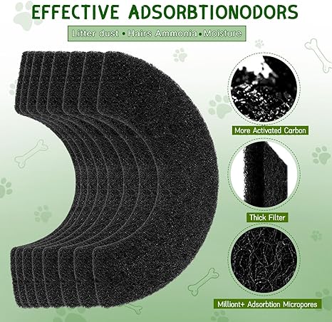 Activated carbon 【Compatible Models】This activated carbon filter are compatible with model 4 and for model 4 connect, which can reduce better odor and get fresher air. 【Pet-Friendly Material】Our filter replacement for cat litter box adopts fiber activated carbon with millions of tiny pores, which increases high absorption and makes the filtration performance more powerful. In addition, this carbon pre filter is non-toxic and tasteless, environmentally friendly, and safe for pets. 【Reduce Odors at Home】This cat litter box filters are aimed at controlling the odor of the litter drawer, reducing the impact of unpleasant water from pets on the air, neutralizing odors in the home and maximizing a fresh home atmosphere. Activated carbon charcoal pads trap urine and feces odors in their pores so your home smells clean and fresh. 【Easy to Use】You just need to remove the old filter sponge and replace it with the new charcoal litter box filters to finish the installation, which only takes a few minutes without any additional tools and knowledge. 【8 Pcs for 8 mth】We offer 8 carbon filters fit for model 4 and can replace according to your cat's usage patterns. However, in order to best control the odor, it is recommended to replace it once a month, so that your litter box filter system will last about 8 months.