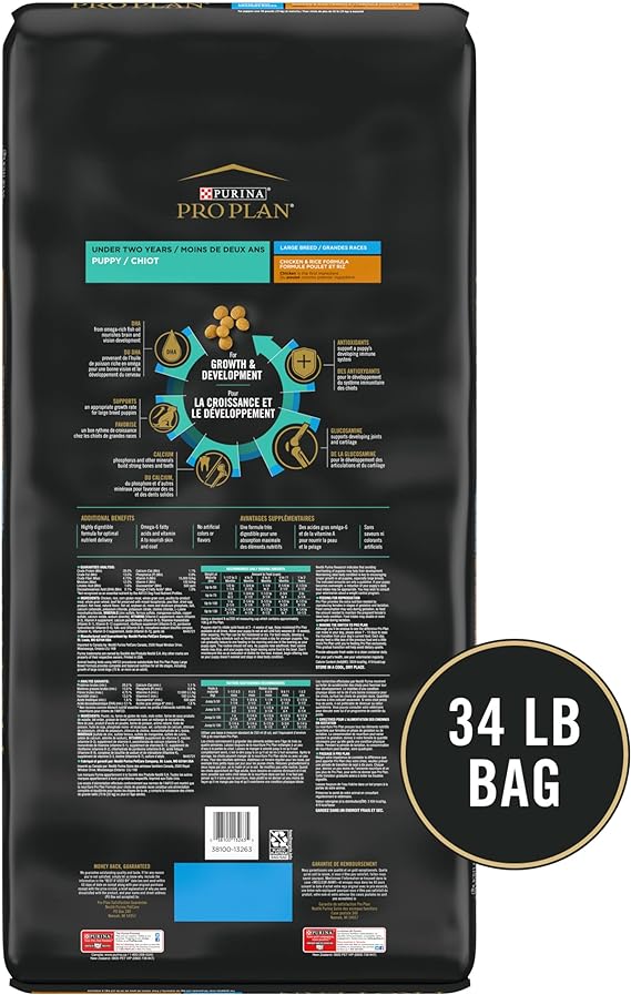 Formulated to support an appropriate growth rate for large breed puppies Glucosamine supports developing joints and cartilage Vitamin A and omega-6 fatty acids to nourish skin and coat High protein formula, with real chicken as the first ingredient DHA from omega-rich fish oil nourishes brain and vision development