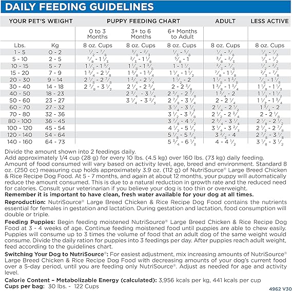 CONTAINS: (1) 26LB Bag of NutriSource Chicken and Rice Dry Dog Food for Large Breeds As a member of our grain inclusive series, NutriSource Chicken and Rice Dry Dog Food is formulated to meet AAFCO guidelines for all lifestages NutriSource grain inclusive formulas deliver compact nutrition and include prebiotics and probiotics to help support a healthy gut Balanced Omega-3 and Omega-6 fatty acids along with L-Carnitine, taurine, choline chloride and DL Methionine supplementation to promote heart health make NutriSource grain inclusive formulas stand out Go Full Circle: Give your dog the variety they crave, maintain a healthy gut with rotational feeding, and optimize nutrition by introducing diverse proteins—all with simple steps, tasty options, improved digestion, less scratching, more energy, and a fun and fresh approach to keep your pup happy.