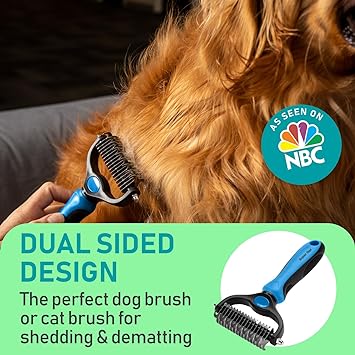 DUAL-SIDED DESIGN: Our grooming brush is perfect for dematting and deshedding your pet's coat! With a dual-sided design, use the 9-teeth side to tackle stubborn mats and tangles and the 17-teeth side to thin out and deshed your pet's fur. HEALTHY COAT AND REDUCED SHEDDING: The deshedder brush for dogs allows you to easily and safely remove mats, tangles, knots, and loose hair. Designed to work for long coats, wiry coats and double coats. Not intended for short coats. EFFECTIVE DESHEDDING TOOL: Our dematting and deshedding tool gently removes loose hair and eliminates tangles, knots, dander, and trapped dirt. The perfect cat brush or dog grooming brush solution for pets with thick fur or dense double coats. COMFORTABLE TO USE: Keep your pet's coat clean and healthy with our undercoat rake for dogs. This dog brush is designed with a lightweight, comfortable, non-slip rubber handle to keep the brush from moving around as you groom your pet. How to Use: Using minimal pressure, glide along fur to remove tangles, and mats. When using on loose skin, be sure to pull loose skin tight to prevent catching on the blade. Its important to let the rake do the work and to use short gentle strokes on your pet.