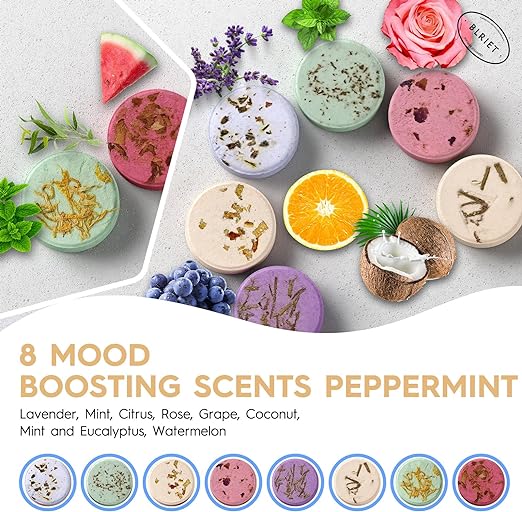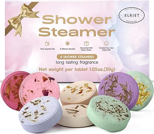 Perfect Gift Options - Beautiful package for you to send as a gift without repackage it. Containing 8 packs of 7 scents, every bath is an amazing experience. Natural Ingredients - BLRIET is made with the finest ingredients. Soothing and no side effects, you can enjoy mesmerizing personal spa without worry. Superior Scent - Developed and repeatedly blended in the laboratory by master perfumers. Deep Relaxation - Newest shower steamers formula with stronger scent and longer lasting effects. Highest concentration of flavor, with 20% to 45% more aromatic compounds than other products. Personal Spa - A one-of-a-kind home spa experience where scented steam will slowly envelop and surround you, enjoy the serenity.