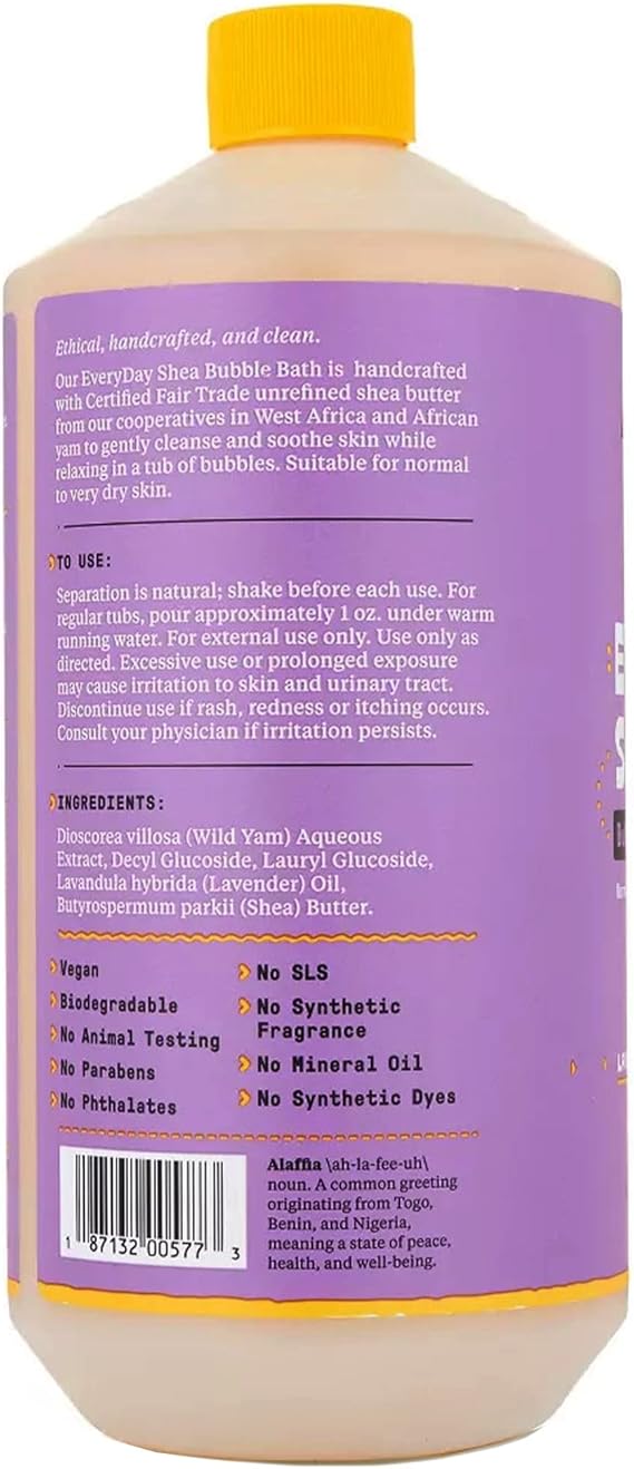 SHEA BUBBLE BATH. Alaffia EveryDay Shea Bubble Bath is sulfate-free and clean, handcrafted with African wild yam extract and fair-trade unrefined "raw" shea butter from our cooperatives in Togo, West Africa to gently cleanse your skin. RELAX & UNWIND. Soothe and nourish skin while relaxing in a tub of bubbles. Skin loving and nutrient-rich ingredients collide for a truly relaxing bubble bath! You'll notice our ingredients list is short, meaning we've included only the essentials. Simple pour 1 oz into running water and enjoy! LAVENDER. A calming and herbaceous aroma with soothing floral notes that create a relaxing and refreshing spa-like bathing experience. CLEAN, FAIR TRADE, SULFATE-FREE. Made with love and respect. Alaffia products contain "NO" sulfates, parabens, phthalates, silicones, mineral oil, artificial color or synthetic fragrance. Proudly Cruelty-free. Alaffia is a social enterprise on a mission to create a more sustainable and equitable future. Our women-led cooperatives in West Africa produce fair-trade ingredients rooted in tradition. When you choose our handcrafted products, you join us in supporting education, maternal care, and environmental sustainability.