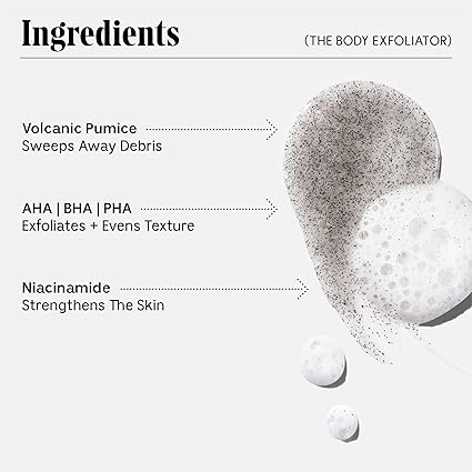 SKINCARE FOR THE BODY: A weekly physical and chemical exfoliation treatment with AHA/BHA/PHA, Charcoal and Volcanic Pumice to detox and resurface the skin. CLINICALLY-PROVEN INGREDIENTS: 6.5% Physical Exfoliation, 1.25% Chemical Exfoliation are infused into a Plant Surfactant base. Charcoal Bamboo provides a skin detox while Volcanic Pumice and AHA/BHA/PHA help to resurface skin. FORMULA FACTS: Hypoallergenic. Dermatologist-Tested. Non-Comedogenic. Fragrance-Free. No SLS / SLES. Cruelty-Free. Certified Vegan. DIRECTIONS: The Body Exfoliator is designed as part of a weekly ritual. Use 1-2 times a week or as desired. Apply all over body. Massage for foam. Rinse well. FOOTPRINT: The Body Exfoliator comes in a 30% PCR Tube. Certified B Corp. Certified Climate Neutral. Certified Plastic Neutral. 1% For The Planet Member. FSC-Certified.