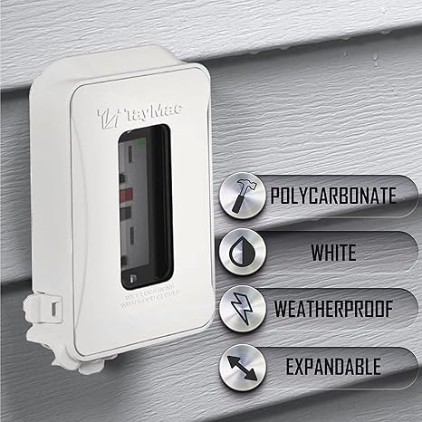 WEATHERPROOF COVER: Get tough and reliable protection, the white polycarbonate 1-Gang Weatherproof In-Use Electrical Outlet Cover for home improvement is NEMA 3R rated and cULus listed for wet and damp locations. EASY TO INSTALL: Set up your outdoor outlet cover in no time at all. Quick-Fit keyhole mounting system allows installation under a minute for either horizontal or vertical mount. 16 CUSTOM CONFIGURATIONS: Our weatherproof outlet cover uses UFAST for 16-in-1 custom device configurations. You can mount and protect duplex, switch, round, or GFCI outlets. QUALITY CONSTRUCTION: Our socket cover for outlets is built from high-impact polycarbonate for maximum durability and synthetic neoprene rubber that won't dry rot, crack, or deteriorate in sunlight. EXPANDABLE DESIGN: Our weatherproof expandable cover can extend from 1 inch to 3 inches deep depending on your needs. The clear window allows for quick visual inspection without opening the unit.