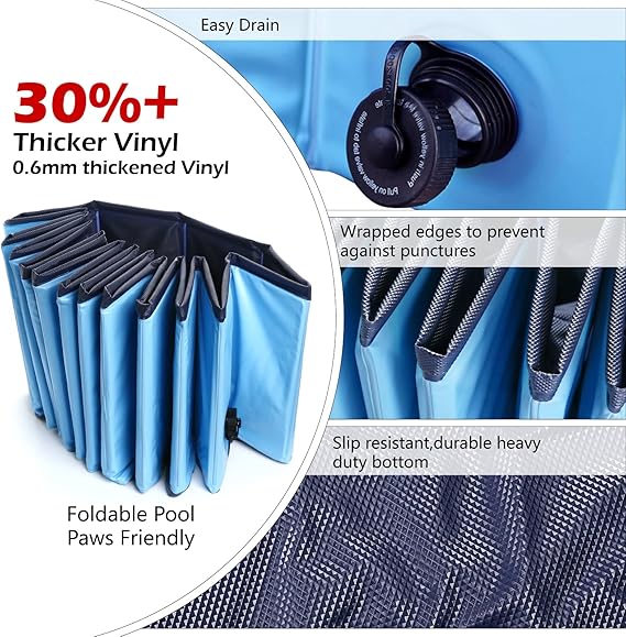 Portable and Foldable Pool: easy to store and bring with you and your dog everywhere. It can be used as dog pool kiddie pool kids pool wading pool pet dog bath tub etc. Simple to Set Up and Drain: No need of inflation, set up in no time. With bottom/side drain, easy to drain and refresh water. Perfect plastic pool for backyard outside. Extra Hose Connector Included: Yard/grass gets flooded? Simply connect a garden hose and easy to drain. 2022 Upgraded Heavy Duty Vinyl: Super durable 3 layers laminated vinyl with polyester mesh. Puncture Resistant and prevent collapse outward. Slip Resistant: Inner wall and the bottom is made of extra-tough embossed plastic. Thick and non slip to prevent kids and pets from slipping. Full size pools for puppy, small dogs, medium dogs and large dogs. Environmentally friendly material: EN71, ASTM standard. Please Trim your dogs' nails before using the pool.