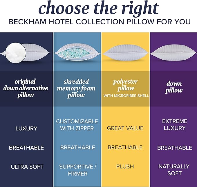 SUPERIOR COMFORT - Queen pillows have a 250 thread count cover filled with a soft down alternative. One of the best first apartment or new home essentials gift for bedroom, guest bed room, college dorm or house decor. KEEP COOL - If you easily overheat, or maybe you're looking for cool queen size pillows for night sweats, the breathability of our standard bed pillow can offer welcome relief. SAFE & SOUND - These fluffy bed pillows are made in an OEKO-TEX Standard Certified factory that ensures textiles meet high safety and environmental standards. EASY CLEAN - Unlike memory foam pillows, our pillow for side sleepers is designed to make life as easy! Simply pop them in the washer and tumble dry. NO SHIFT DESIGN - Whether you're a back, side, or stomach sleeper - our cooling pillows for sleeping can accommodate! The plush bounce-back design of this firm pillow will keep its shape in any position.
