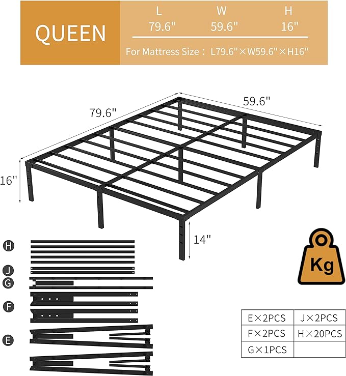 【Elevate Your Bedroom Aesthetic】: Crafted from Sturdy iron, our bed frame boasts a sleek and minimalist design. Enhance your home decor with the modern style of this bed frame, adding an element of elegance and refinement to your bedroom. 【STRONG STABILITY】: This metal bed frame is supported by upgraded metal rods and metal legs, which stand the test of time. Our bed frames are made of heavy duty reinforced metal rods, reinforced with thicker material to make them more stable and load bearing. 【NOISE FREE】: The sturdy steel slat support system makes the metal bed more stable without any annoying creaking.Don't hear the squeak of the bed frame rocking when you roll over in the middle of the night. 【SPACE SAVING】: This bed frame has a large storage space under the bed, which brings you ample storage space and easy cleaning. Can be arranged according to your needs for storing extra odds and ends. Raised bed frames allow you to enjoy more storage space for bedroom items and help reduce clutter in the room. 【WIDELY APPLICABLE】: The platform bed frame can be used in bedrooms, guest rooms, dormitories, hotels, etc.