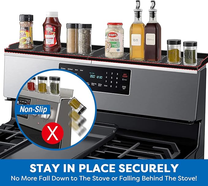 【Space Saver】Perfect for organizing your spices,holding condiments, no more getting mess or searching for the spice you need while cooking! Keeping all of the small things within close reach and won’t take up valuable counter space. Creates more usable space in your kitchen! 【8 Strong Magnets】8 large magnets cover the entire back area ensures sturdy enough to support and it would be much more securing. It clings to the top of the stove so there is no movement or possibility of anything falling off. Great for the gap or flat top ovens. 【Stay in Place】 hold things on the back of stove securely and in place. your stuff won't fall down to the stove any more when you open and shut the stove door, bump. also helps block things from falling behind the stove. 【Premium Silicone】secure and made of thick solid silicone it does not get hot or transfer heat to ingredients stored. Sturdy and wide enough to hold a lot of spices. Its more ideal than a metal one so it could be washed and not rust or get totally gunked up. 【Easy to Clean】Flexible, easy lays down and remove for cleaning. heavy silicone able to hold it's shape up and keep your stove clean, it won't slip off the stove top. Great for getting your spices in easy access when cooking. A must have for kitchen organization!