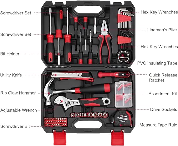 High quality material : High-quality steel and finished in heat-treated chrome attributes strength, durability and anti-corrosion to this set. Comprehensive basic tools : It includes claw hammer, precision screwdrivers, cutting pliers, adjustable wrench, tape measure, dual-head mini ratchet screwdriver, sockets, driver bits and so on. Widely application area : 128 Pcs tool set is a superb choice for most small repairs and DIY projects around the house, such as repairing water pipe, outdoor fittings, garden decoration, garage constuction, car overhaul, etc. Blow molded storage toolbox : Toolbox makes the hand tool set easy to storage. The compact interior design of the box keeps all components tidily in place even during transportation.