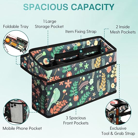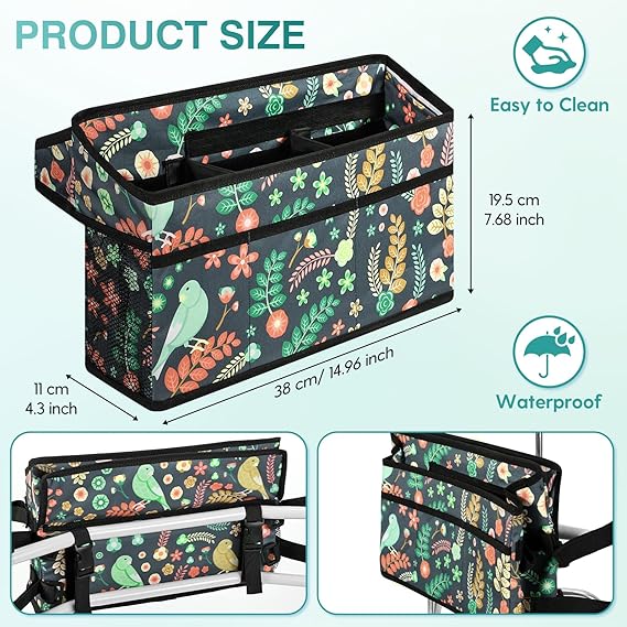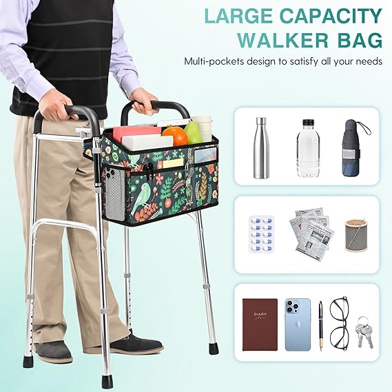 Rhino Valley Walker Basket for Folding Walker, Multi-Pocket Walker Tray with Cup Holder, Foldable Walker Bag, Large Storage Basket for Walker, Walker Accessories for Seniors, Birds