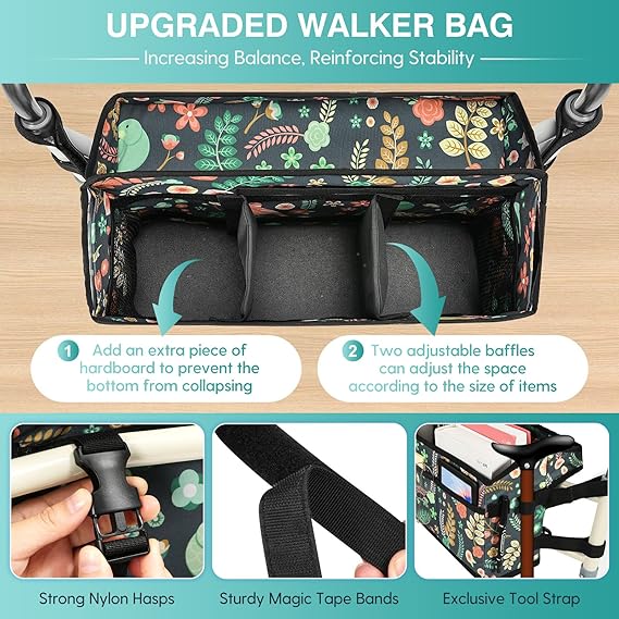 【Added Convenient Tray】The walker storage bag adds the convenient tray on the back to give you more storage space to keep your frequently used items closer at hand, such as your wallet, phone, small snack or umbrella, making shopping trips and daily tasks even easier. The trays for walkers can fold up compactly when not in use. 【Upgraded Stability】Our walker bags have been upgraded in stability to ensure safety. At the bottom, we add a supporting panel to enhance the balance of walker baskets, making the whole structure more stable. Equipped with nylon buckles, you can secure it firmly, so that the walker won't tip over with overweight items. 【Large Capacity】Multi-pocket design increases flexibility and organizes accessories well, allowing you to carry and store your belongings such as glasses, mobile phones, newspapers, medicine, etc. The side mesh pockets can be used to store water bottles, drinks, umbrella and other necessaries. And our walker basket also offers a handy convenience tray for lightweight items. 【Foldable Trait】The removable baffles allow the walker accessories for seniors to hold more weight when placed on either side of the walker bag without deforming. When not in use, remove the baffle and fold up the bag to save space. Lightweight and portable, it can be your great companion of the walker. 【Fit Universal Walkers】This accessories for walkers is an elegant choice for the elderly people with mobility problems. When they want to carry something on the go but can't always free their hands, this walker organizer is a practical solution for them at this time. Suitable for most sizes and styles walker, but NOT suitable for wheelchairs/rollators.