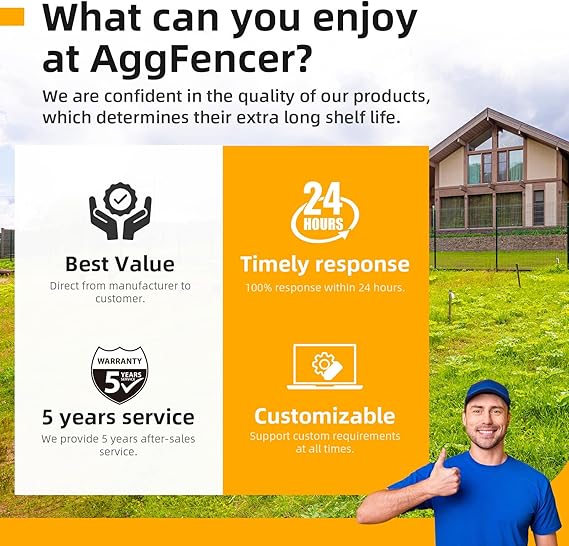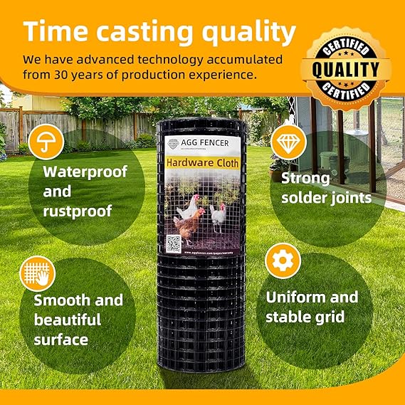 【High quality raw materials】Our hardware cloth chooses the strength, toughness and ductility of low carbon steel wire as the inner core. This determines the basis of the high quality of our products. 【Professional galvanized process】 We have 30 years of experience, the use of advanced production technology. Our metal cloth is impregnated after the completion of galvanizing, which greatly reduces the problem of solder joint rust and greatly prolonging the use time. 【Strong durability】 Our galvanized hardware cloth waterproof, rust proof, corrosion resistance, tear resistance, smooth surface beautiful. Even in a variety of wet, saline-alkali environment still remains the same, is one of the best choice for making fences. 【Multipurpose】Our hardware cloth is suitable for chicken coop fences or other poultry fences, rabbit/cat/dog fences, backyard snake and rat protection fences, garden flower beds, orchard tree protection boards, soil screens, balcony protection, gutters, eaves, gutter guardrails, handicrafts making, etc. 【Brand Guarantee】AggFencer offers a 5 year warranty on all products. Please feel free to contact us if you have any questions. If the listed products do not have the specifications you want, please feel free to contact us for customized services.