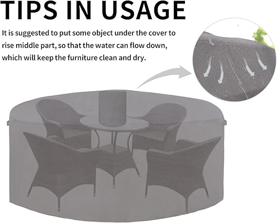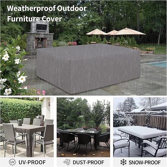 Dimensions: The rectangular furniture cover measures 124"L x 71"W x 28"H, which fits outdoor sectional furniture set and rectangular patio table and chair set. Kindly measure your furniture size before purchasing. It is suggested to choose the cover 1-2 inch larger than your furniture size. Waterproof: The fabric of the outdoor furniture cover is processed with waterproof treatment, coated with PVC backing, can be 100% waterproof, and the reinforced sewing ensures that the water won't seep into the cover on rainy days. Weatherproof: The patio furniture cover is made of heavy-duty oxford fabric, which is durable for long time use, offering protection from natural damage like sun, dirt, rain, snow, etc. Keeping your furniture set to be safe, clean and dry. Windproof: Fastening the 4 quick-release buckles in each corner to table leg can prevent the cover from being blown off on windy days. There is a long adjustable strap at the middle of long side bottom to be closed across the furniture for a tight fix. Easy Use and Care: Two padded handles at each side for easy installation and removal. It is easy to clean, just wipe with water. Do not put it in the wash machine.