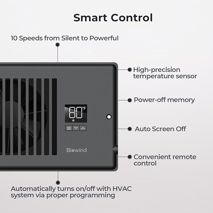 Quiet Register Booster Fan: A quiet fan system designed for improving wall and floor vents airflow from HVAC systems to increase home comfort. Eliminate Uneven Room Temperatures: Biowind smart register vent equipped with programmable LED controller and high-precision temp sensor to work with HVAC. It can automatically turn on/off vent fan to heat or cool the rooms at the right time. New Upgraded Remote Control: Remotely adjust the fan speed(0-10 level)to meet user different needs and make a perfect balance between noise and comfort. No need to get up, More convenient. Energy-Saving & Cost-Effective: This vent booster fans are more energy-efficient to traditional AC and cooling devices. They rely on airflow to improve indoor temperature and circulation, maximize the heating or cooling from your HVAC system with minimum energy. Besides, This smart register vent continues running after HVAC system off, pulling every bit of heat or cold air into your home. Help you save more energy & electricity costs. Compact & Easy to Install: Biowind smart register booster fan is small in size and easy to move or install,making them convenient to use. Fits ONLY 4" x 12" Register Vent| Rated power: 6W | AC Input: 100 to 240 VAC| Airflow: 120 CFM | Noise: 18 Dba | Includes Wall Adapter, plug and play. Affordable: Compared to large-scale air conditioning and cooling devices, booster fans are relatively inexpensive and affordable, making them accessible to ordinary households.
