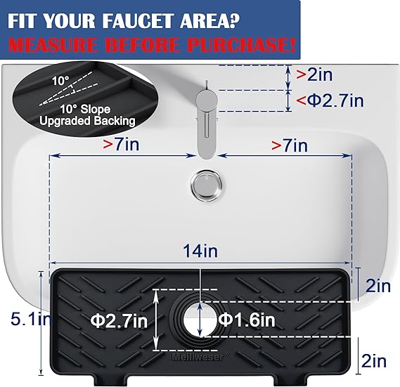 【Slope Improved】 We improved the overall slope, up to 0.3 inches at highest and up to 10°degrees, which means a greater slope, allowing surface water to drain away more easily and always keep your sink & faucet area dry. 【Better Adaptable】Adaptable to multiple sizes, we planned an installation hole from 4cm to 7cm, and it has 360° wrapping to adapt to more diameters faucets and better wrap around your faucet. 【Perfect Organizer】 The areas on both sides of the round hole can be used to store your daily cleaning tools and detergents. You can place brushes, sponges, and detergents on it to keep your countertop tidy. 【Premium Quality】 Made with 100% food grade silicone, our splash guard is better than other fabrics available. It's safe, durable and easy to clean, providing long-lasting use. 【Multiple Uses】This versatile splash guard can be used in various areas of your house, including the kitchen, bathroom, laundry, sink, farmhouse, bar, and RV.