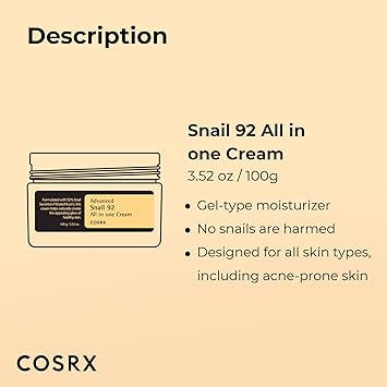 Long-lasting Hydration: Infused with 92% of snail mucin (also called Snail Secretion Filtrate), this cream builds a moisture barrier to plump, hydrate, and soothes skin. This everyday multi-solution cream glides onto the skin and revives skin radiance. Supercharged Repairing Moisturizer: A light-weight, gel-type cream repairs and soothes irritated, sensitized skin after breakouts like rosacea. This cream moisturizer is powered by snail mucin, hyaluronic acid, and betaine to strengthen the skin barrier by replenishing moisture. Key Ingredient: Snail Secretion Filtrate contains "Mucin"- an EFFECTIVE ingredient for enhanced moisturization. It instantly soothes damaged skin and delivers moisture deep into your skin. Perfect for dehydrated and damaged skin. NO Snails are Harmed: Snail Mucin is obtained in a safe and environmentally friendly way in a favorite environment of snails and then processed as a cosmetic material. 100% Natural, Hypoallergenic, Dermatologist-tested. COSRX Standards: All COSRX products are formulated with skin-friendly ingredients that alleviate irritated skin. Hypoallergenic, Dermatologist tested, Animal Testing-FREE, Parabens-FREE, Sulfates-FREE, Phthalates-FREE