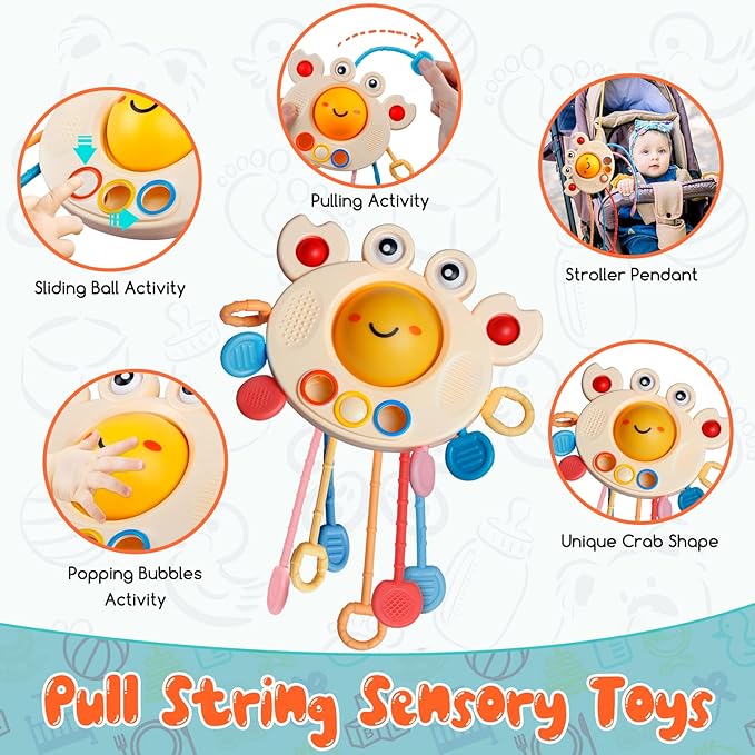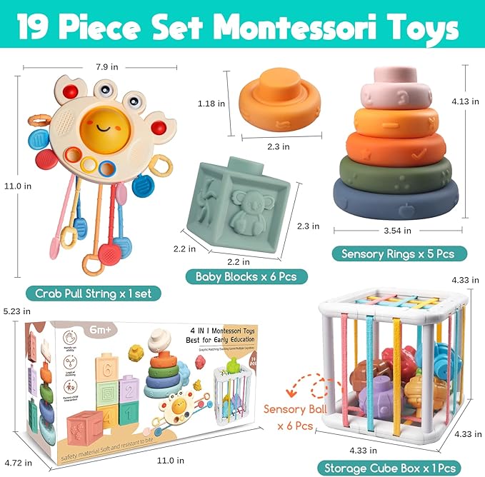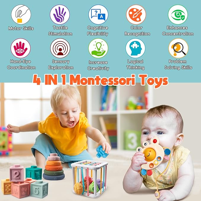 4 in 1 Montessori Toys Set : Enhance your baby's development with our comprehensive babies toy set featuring building blocks, stacking ring, pull-string toys, and cube toddler toys. These toys aid in color and shape learning recognition, sorting skills, fine motor skills, hand-eye coordination, spatial awareness, cognitive flexibility, language skills, creativity, problem-solving, logical thinking, and encourage exploration. Give your baby the best start in life with our specially designed toy set Pull String Infant Toys : Adorable crab-shaped baby teething toy designed with 6 silicone pull cords of varying colors and thicknesses, this toy not only encourages toddlers to practice their grip strength but also provides a satisfying object to chew on. The toy's disc case features a button ball and bubble popper balls, making it a versatile plaything that can also be used as a stroller pendant. Its bright colors and fun design will capture your child's attention, and the toy's durable construction ensures long-lasting use Building Blocks / Stacking Rings Toys : Our building toys feature embossed animal, fruit, and geometric patterns, as well as Arabic numerals, providing a multi-sensory experience for your child. Similarly, our stacking rings set includes five soft rings in various sizes and colors, each engraved with numbers, letters, and adorable textures that your little one can chew on. By touching and observing these patterns, your baby can develop their sense of touch and vision. Invest in these toys to support your child's cognitive development Explore Sensory Bin : This busy toy set features a vibrant cube box with elastic bands and 5 blocks that come in different colors, textures, and shapes. The blocks are great for bath time games and produce an enjoyable ringing sound that is sure to attract your child's attention. Your little one can develop their fine motor skills and spatial awareness as they manipulate the block, exploring their curiosity and promoting discovery. These toys are designed to enhance your child's development and stimulate their senses. Buy now for an engaging and educational play time Great for Kids : Enhance your child's happiness and imagination with our brain-stimulating sensory toys. Our toys are designed to promote creativity and intelligence, making them the great toy for age 1+ girls and boys for any occasion, including birthday, Easter, Christmas, Children's Day, and New Year's Day. They are also convenient for outdoor activities such as picnics, fidget car and airplane travel, parties or indoor table, floor mat, bed. Pack them easily in a bag and take them wherever you go