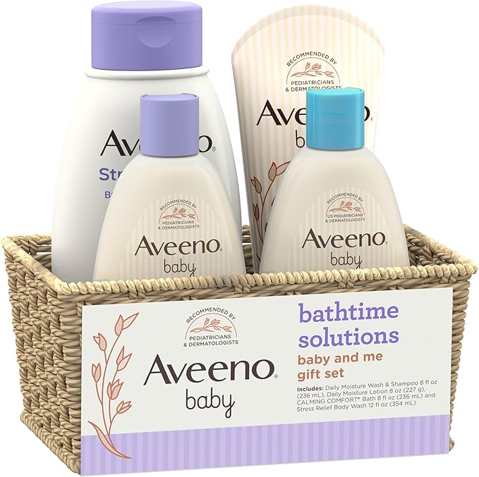 4-piece Aveeno Baby Daily Bathtime Solutions Baby & Me Gift Set is a collection of baby bath essentials in a convenient, reusable wicker basket that includes everything you need for bath time with your little one, plus a bonus for mom Aveeno Baby Daily Moisture Wash & Shampoo cleanses your baby's hair & sensitive skin without drying. The gentle tear-free & hypoallergenic formula makes it suitable for everyday use Aveeno Baby Calming Comfort Bath & Wash with soothing scents of lavender & vanilla to help naturally relax baby before bedtime for a more restful sleep for your little one. It is formulated with nourishing oatmeal and help nourish baby's skin Aveeno Baby Daily Moisture Lotion for sensitive skin is clinically proven to moisturize your little one's delicate skin for 24 hours. It deeply moisturizes your little one’s skin & helps soothe & restore baby’s skin moisture barrier Aveeno Stress Relief Body Wash for mom combines natural colloidal oatmeal with scents of lavender, chamomile and ylang-ylang oils for a relaxing, soap-free cleanse that is gentle enough for everyday use