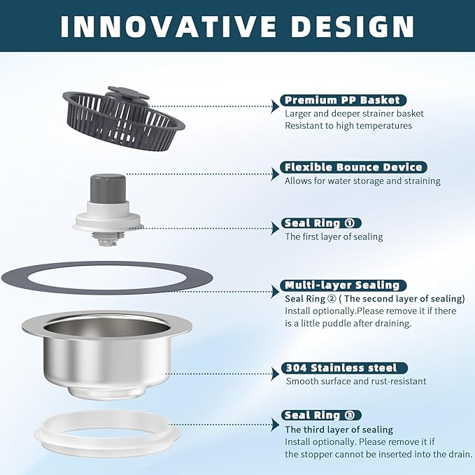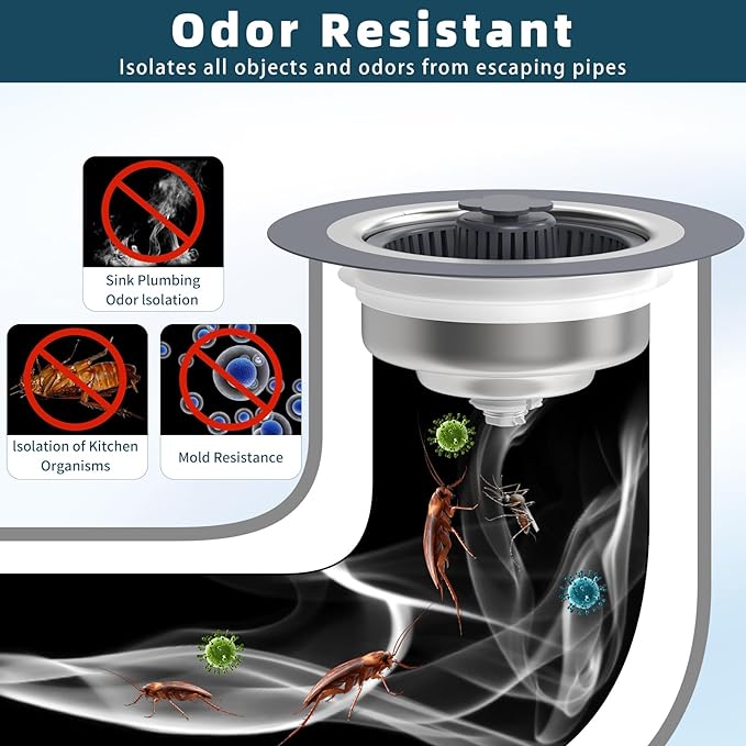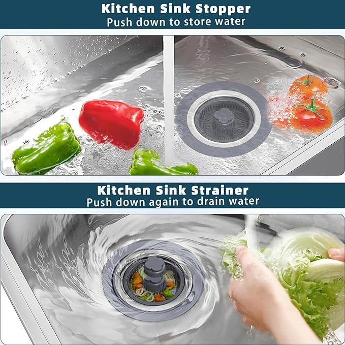 【3-in-1 Design Kitchen Sink Drain Stopper】 3 function of the sink strainer: water storage, strainer and odor isolation. Multi-layer sealing gaskets makes this sink stopper ensures leak-proof water storage while effectively isolating kitchen drain odors. It can be used to fill the sink with water for cleaning and soaking purposes. The perforated basket allows easy filtration of kitchen waste without impeding water flow, which can easily captures food, waste and debris to prevents clogging in kitchen pipe. Simply push down the button to store the water, push again to drain the water, easy use. 【Suitable for US Standard Kitchen Sink】 This kitchen sink drain strainer is available when the diameter of the drain opening is between 2.83-3.38 inches and the depth is greater than 1.7 inches. Please be sure to measure the inside diameter and depth of the sink drain before purchasing. Anything not clear, please feel free to contact the Service Team. [Durable Material Kitchen Sink Stopper] Sink protectors for kitchen sink Kitchen sink plug, is consists of 304 stainless steel body and ABS material plastic sink strainer basket, which is no deformation easily, which is resistant to high temperatures, deformation, and rust. Great sink strainer kitchen drain choice. [Effective & Easy to Clean Pop-up Stopper & Drain Quickly] Compared to the other kitchen sink strainers, the larger and deeper strainer basket which allows to collect more food waste. The PP strainer basket is very easy to clean that does not stick slight food garbage like a traditional metal sink strainer net. It is suitable for various places including kitchens, restaurants, hotels, and canteens etc. 【Pop-up Spring Stopper Kitchen Drain Strainer】 The pop up kitchen sink drain stopper is equipped with upgraded one-piece spring-loaded design. With just one press, water storage, press again, fast drainage strainer. It's very convenient sink stopper kitchen drain, kitchen essentials.