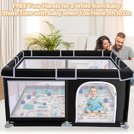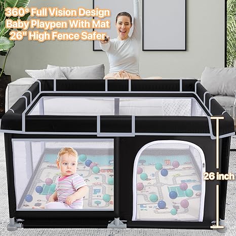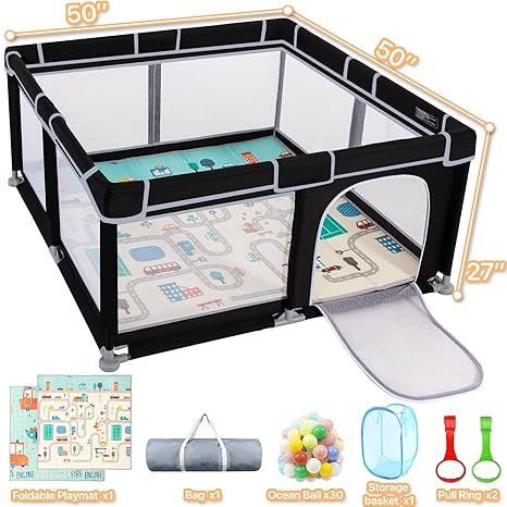 【Liberate Hands】The Large Baby Playpen evolves into a secure play yard for your babies, fostering exploration, independent movement, and joyful playtime. This facilitates parents in managing other tasks while ensuring the safety of their children. 【ECO-FRIENDLY & DURABLE】Crafted from safe and environmentally friendly materials, this playpen for babies and toddlers is not only gentle on your baby's skin but also simple to clean and maintain. Its durable fabric guarantees longevity, offering parents a worthwhile long-term investment. Which supplies added cushioning, effectively reducing discomfort when babies accidentally bump into the playpen.Furthermore, our baby playpen with mat is entirely enveloped in soft cloth, leaving no exposed gap 【Simple Assembly】The baby play pen and toddlers is constructed using alloy steel pipes and plastic joint connections, making both assembly and disassembly effortless.Baby play pen with mat can be taken mounting within minutes, without the need for any tools. 【360° Full Vision Design】The four side walls of the play yard for baby are made of visible and breathable mesh, allowing your child to see their surroundings while sitting or lying down. This transparency fosters a sense of security as they catch glimpses of you outside the fence. The thoughtful inclusion of a zipper-design external gate enables easy interaction with your baby whenever needed, further reinforcing their comfort and security. 【Ideal Combination】When you purchase our products, you receive not only a spacious robustness 50x50 playpen but also a baby playmat of identical size, a versatile storage bag, 30 ocean balls, 2 pull-up rings to aid your baby in standing up, and a convenient portable play yard for baby storage bag!