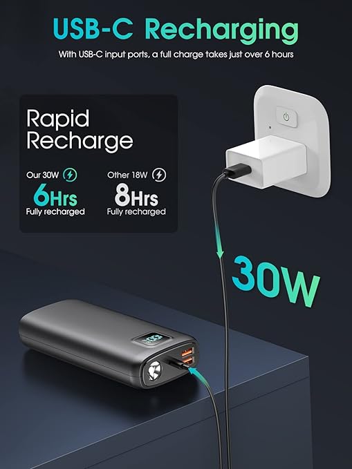 Portable charger adopts the latest Super Charger Protocol and Fast Charger Protocol. Support QC4.0+PD30W super fast charge, it only takes 30 minutes to charge your iPhone 13 from 20% to 80%, which is 3 times faster than most ordinary old power bank 10W portable chargers on the market. The Power bank has a built-in Type-C port and two USB ports, and it can charge three devices at the same time. Simultaneously charge your phone, tablet, headphones and more with one solution. Can be shared with friends to charge together. Portable charger has a large capacity of 40000mAh. Using the new high-density polymer battery, it has a larger capacity under the same volume. A single charge is enough to charge your phone for a whole week. Let you get rid of the anxiety about the battery level of your mobile device anytime, anywhere. We only use the highest grade materials to make this power bank, from the fireproof case, the PCB motherboard with 10 safety protection designs can filter most dangers such as overcharging, over-discharging, short circuit or overheating, well-known brand super-grade lithium polymer safe battery Core, after rigorous 8-fold inspection. Just to let customers get a safe product. Power bank portable charger built-in high-precision smart LED digital display can accurately reflect the percentage of remaining power. Allows you to easily track your battery status.There is also a built-in super bright flashlight, it can dispel the darkness, very practical.Power bank is also equipped with a high brightness flashlight with 360 lumens. With the large battery capacity of the portable charger itself, it can go on for a long time to dispel the darkness for you.