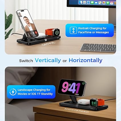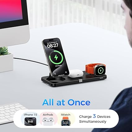 3-IN-1 ULTRA-FAST WIRELESS CHARGING STATION: Fast charging for iPhone 15/14/13/12, Apple Watch, and AirPods simultaneously with our wireless charger stand, which reduces cable clutter, saves space, and keeps everything organized. With a powerful 15W, your iPhone 15 Pro Max charges 50% in just 30 mins, ensuring you are connected and ready to go. Perfect for nightstands and offices, the Apple charging station keeps your devices fully charged overnight and ensures a tidy, efficient workspace. STRONG MAGNETIC SNAP ALIGNMENT: Built with 16 powerful N52 magnets and compatible with MagSafe technology, the Apple Magsafe charger will auto-align your phone's charging coil for efficient and safe charging, eliminating the hassle of finding the right position. Enjoy quick one-handed phone removal. The integrated magnetic Apple Watch charger ensures that your iWatch charges with precise magnetic alignment without worrying about movement or slipping during charging. FOLDABLE DESIGN & ADJUSTABLE VIEW: Simply lift the phone and watch stands to switch from a flat to an upright charging position or fold them back down for a flat, compact size, easy to carry for travel. The phone charger stand adjusts up and down to 70°, allowing you to find the perfect viewing angle. This foldable charger 3 in 1 Apple supports horizontal charging for watching movies or getting the IOS 17 StandBy mode and vertical charging for FaceTime video calls or checking messages. MULTI-SAFETY PROTECTION & SLEEP-FRIENDLY: Our wireless charging stand offers multiple protections, including over-voltage and over-current protection to protect battery health, temperature control to keep your device cool, and short-circuit protection for enhanced safety. Foreign object detection ensures safe charging by identifying metal objects. The LED indicators turn off after 10 seconds and confirm each device is charging without disturbing your sleep, ensuring a peaceful night. HIGH-GRADE MATERIALS & BEST GIFT: The surface of the iPhone magnetic charger is coated with a layer of eco-friendly rubber oil, providing a comfortable touch, and easy cleaning. Its sleek and elegant design complements both bedroom and office settings perfectly. The Apple charger station also is a thoughtful gift for family, friends, or loved ones, and a perfect present for graduates, adding a touch of modern convenience to their daily lives.