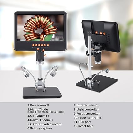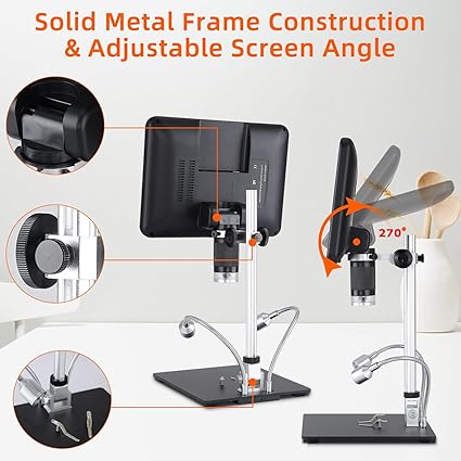 【Large 10.1-inch IPS display】The LCD Microscope equipped with large 10.1-inch screen allows you to get a larger field of view directly from the screen without an additional connection to a computer. This IPS display provides more saturated colors and clear details than ordinary LCD displays. 【12.6 inches heightened gear bracket】The Handheld Digital Microscopes heightened design is convenient for observing larger objects, and you can get a complete coin view without installing an additional extension tube, which is convenient to use. 【Angle adjustable display USB Microscopes 】We designed this monitor to be adjustable, you can choose the most comfortable and suitable angle to give you a better experience. 【 Excellent lighting effect】Coin Microscope There are 8 LED lights around the bottom of the lens and 2 universal LED lights on the base of the bracket. The brightness can be adjusted. 【Save and export images and videos】Koolertron Digital Microscopes Equipped with a 32G large-capacity memory card, you can save the images and videos obtained during the observation to the card and output them. 【Widely used &Best Gift】Microscope Camera is Perfect for circuit board inspection, QC inspection, watch repair, textile industry, children's education inspection, biological observation (not applicable to cells), medical experts, scientific researchers, insects, coins, jewelry and stamps. It is the best gift for children, students, lovers and other users.