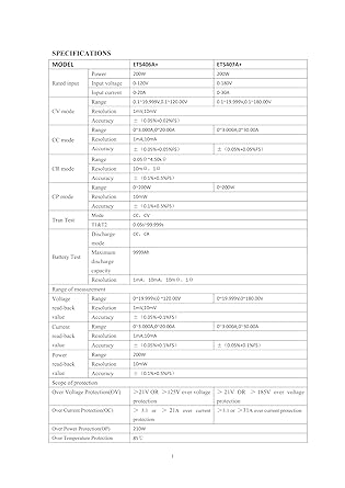 【ET5406A+ Single Channel Programmable Electronic Load Testers】provides 1mV/10mV, 1mA/10mA high resolution and precision with superior performance;Adopting LCD segment code screen with adjustable backlight; 【Remote Control】Support Communication with computer via USB port, please ask supplier to acquire software and SCPI if need. 【9 Common Testing Mode】CC, CV, CR, CP basic measurement modes,;Battery Test Mode, Dynamic Mode, Tran Test Mode,List Test Mode, Short Circuit Test; 【Other functions】Provides overcurrent, overvoltage, overpower, over temperature protection, input polarity reverse prompt; 【PACKAGING and AFTER-SALES】DC Electronic Load x1, output power cord x1, User manual x1; We provide ONE YEAR WARRANTY, please feel free to contact us if any question.