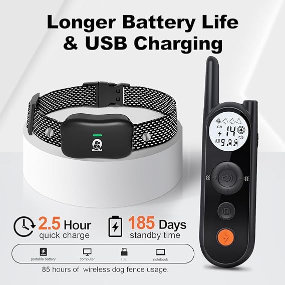 【NEW 2 in1 Fence System】The improved wireless dog collar fence system features a simple operation, allowing you to set it up quickly and easily.MIMOFPET Wireless dog fence with training remote is a combination system that includes both the wireless fence for dogs and the dog training collar train and control your dog's behavior.The electric fence for dogs utilizes dual-directional signal transmission technology, ensuring a stable signal that can be used both indoors and outdoors. 【Portable Dog Fence Wireless】The compact design of this wireless pet fence makes it easy to carry and create the boundary for your pet.The wireless dog fence system has 14 levels of range adjustable distance from 25 to 3500 feet.When the dog crosses the set boundary line, the receiver collar automatically emit warning beep and vibration,alerting the dog to back away.For the safety of dogs, the fence has no automatic electric shock.You can only give the shock command by manipulating the remote. 【3 Safe Modes Dog Training Collar】The shock collars for dogs with 3 modes: Beep, Vibrate(1-9 levels) and Shock(1-30 levels).Three different training modes with multiple levels for you to choose from. We recommend starting at a lower level to test the appropriate setting for your dog.Dog shock collar with remote up to 5900ft range allows you to train your dogs easily indoors/outdoors. 【Incredible Battery Life&IPX7 Waterproof】The rechargeable electric dog fence wireless has long battery life, standby time up to 185 days(If the electronic fence function is turned on, it can be used for about 85 hours.) Tips:Exit wireless dog fence mode when not in use to save power.The training collar for dogs is IPX7 waterproof, ideal for training in any weather and place. 【Security Keypad Lock&LED Light】The keypad lock is specially designed for the safety of dogs, which can effectively prevent accidental misoperation and give wrong instructions to dogs.The dog training remote is also equipped with two flashlight lighting modes so that you can quickly find your far-away dog in the dark.